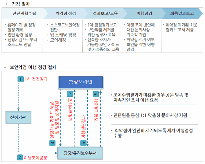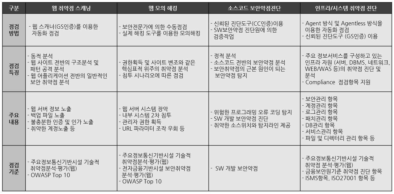 – 관련 용어 :  웹 취약점 스캐닝 점검,  웹 모의해킹, 소스코드 보안약점 진단, 인프라/시스템 취약점 진단 컨설팅