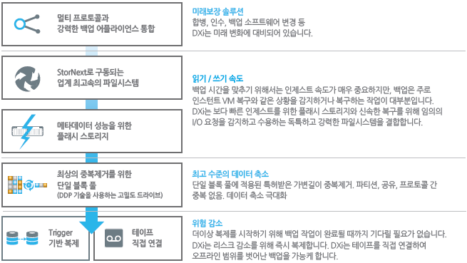 본 자료가 제작된 시점을 기준으로, DXi는 VDMS를 지원하는 유일한 인라인 중복제거 제품이며 VM 즉각 복구를 위한 완벽한 자격을 갖춘 유일한 제품입니다.