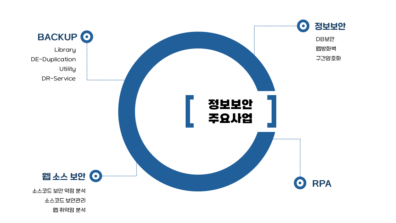 ■ 주요사업Backup Library, De-duplication, DB보안, 웹 방화벽, 시큐어코딩, 소스코드 보안약점, 웹 취약점 점검, 모의해킹, 취약점 진단 컨설팅, RPA 등의 솔루션 전문업체